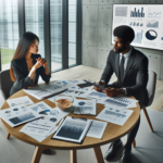 - “Business team discussing due diligence findings in modern office”