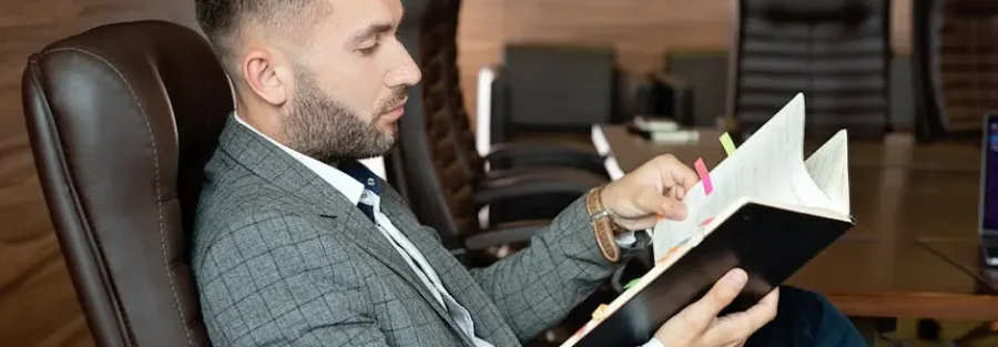 Professional businessman in formal attire reviewing notes in a modern office environment. Career Change